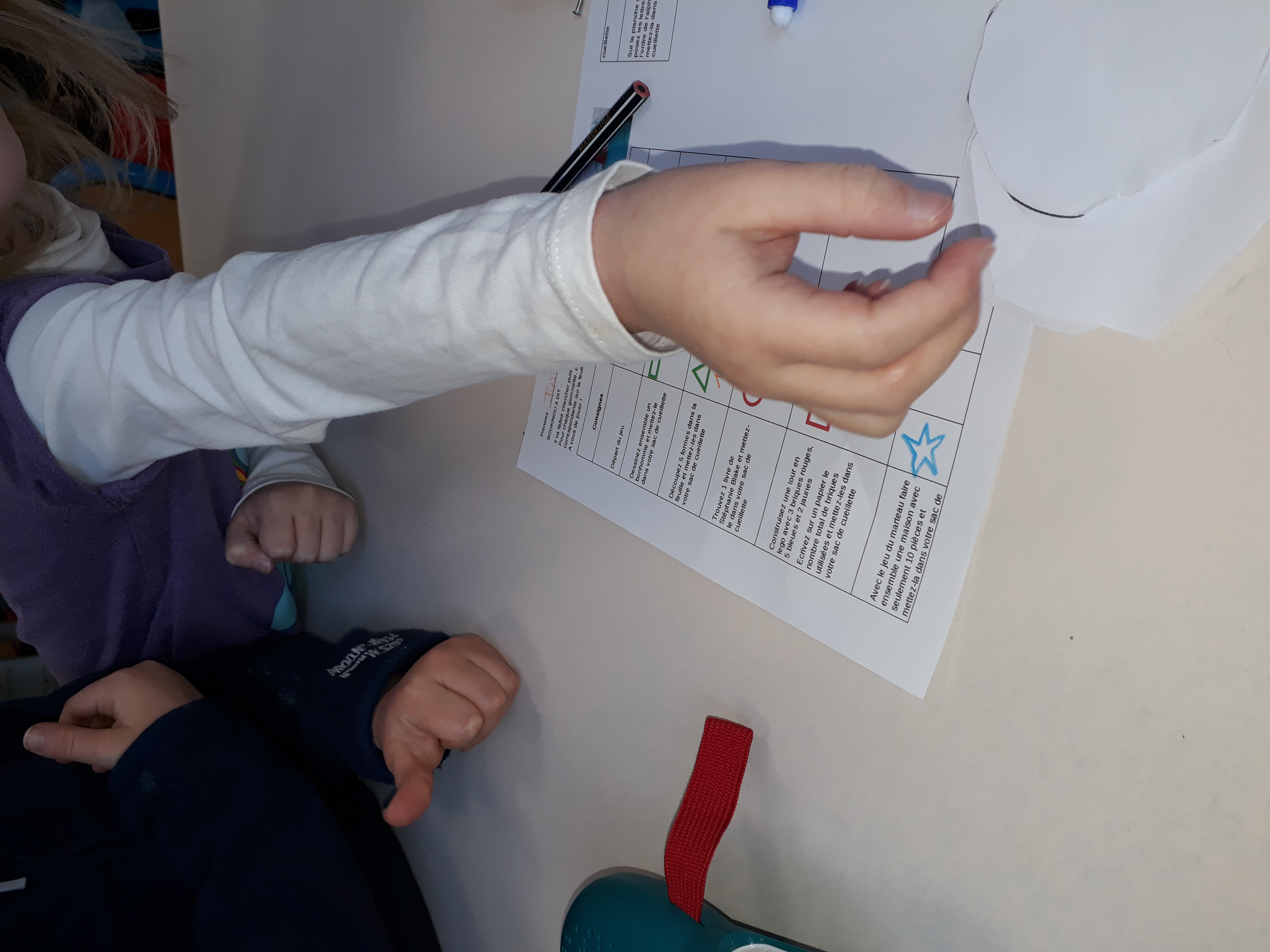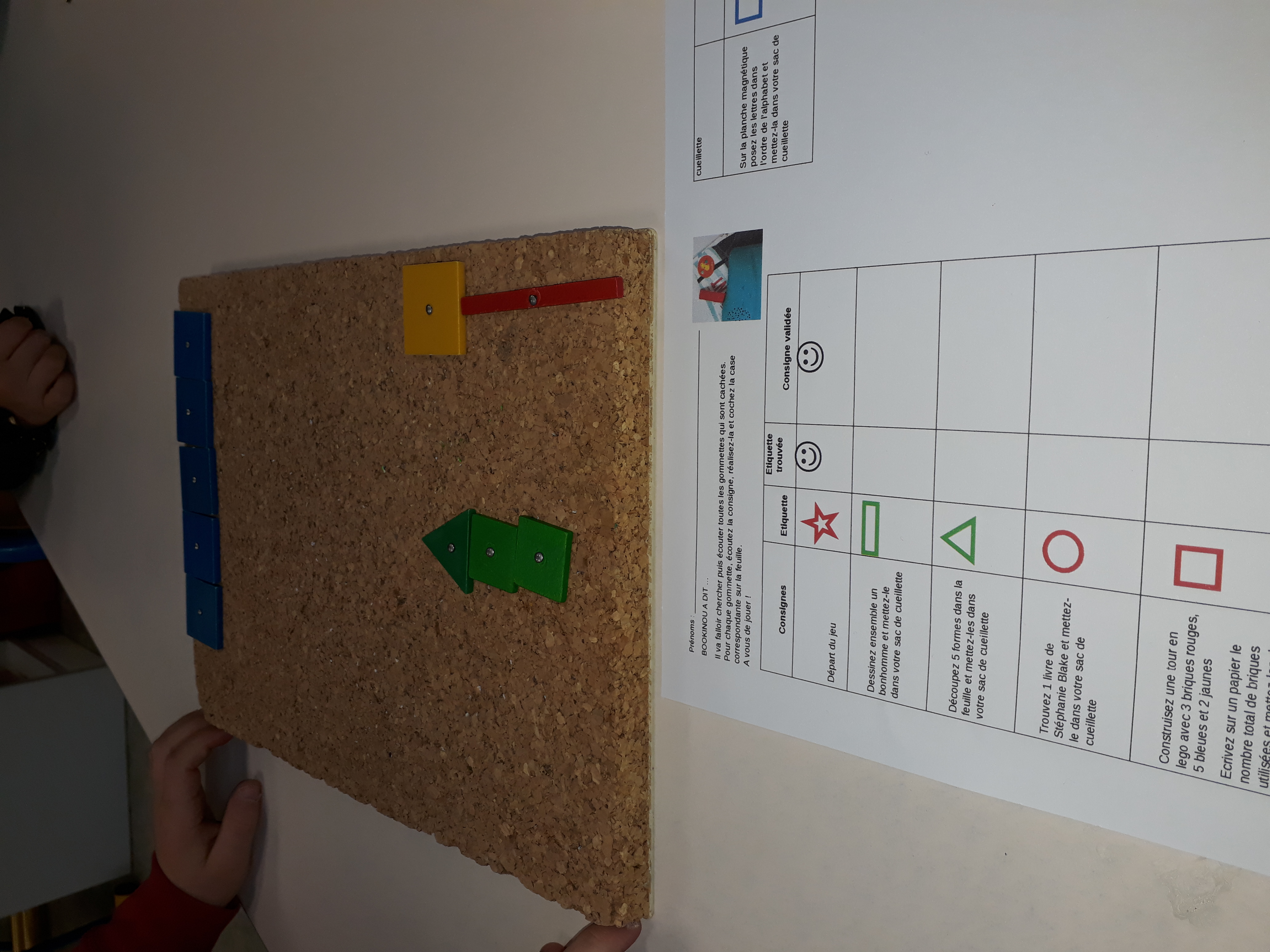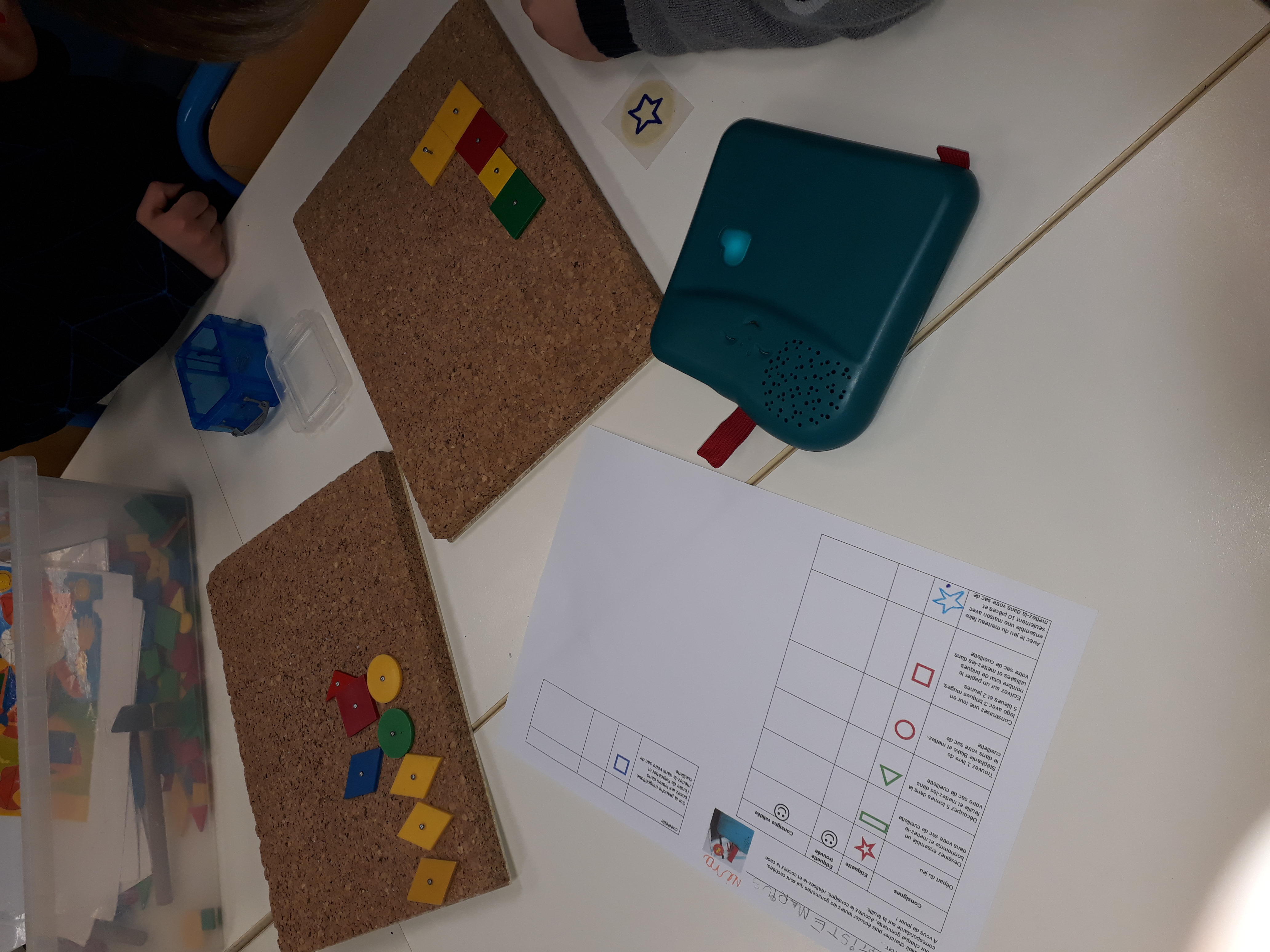 Par groupe de 3 ou 4, il faut tirer une forme puis partir à la recherche de la gommette ayant la même forme. Avec la liseuse, écouter cette gommette (consigne orale) et réaliser la tâche demandée. Revenir à la table de marque pour valider et compléter sa feuille de marque.