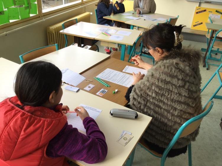 Lors d’une matinée festive, alliant jeux et défis dans la cour, les parents ont joué à une variété de jeux maths expliqués par leur enfant : la numération abordée par « la grande course », le calcul mental à travers « le jeu de la piste », le calcul de périmètres et d’aires par « la guerre des champs »…. Dans les yeux des grands et des plus jeunes, on pouvait lire le plaisir de jouer mais aussi l’enjeu de gagner le rallye maths proposé par cette nouvelle méthode et animé par une autre collègue de la circonscription dans le cadre d’un travail en réseau (Mme Dorine Cacciali de l’école élémentaire Sassenage Château).