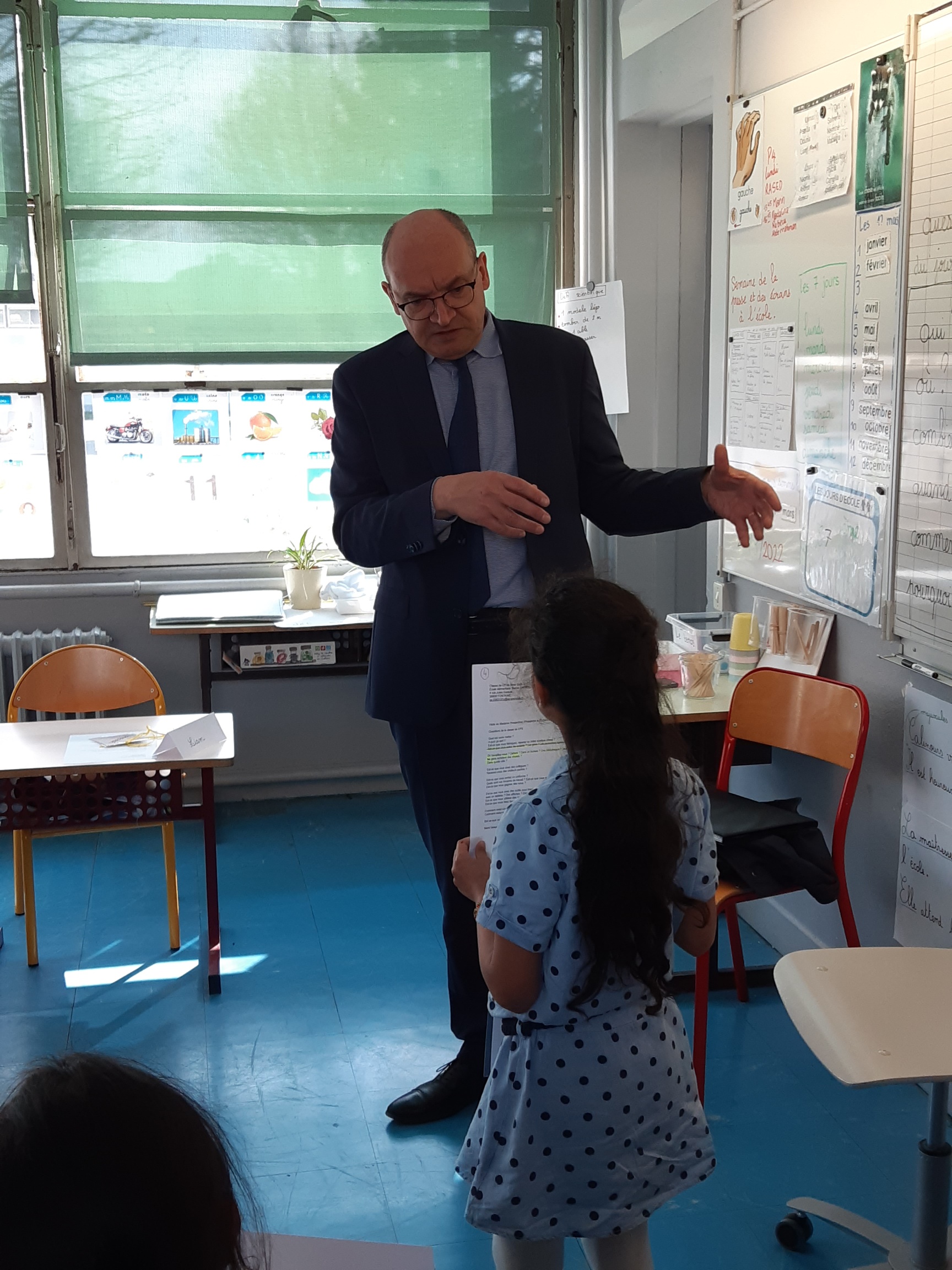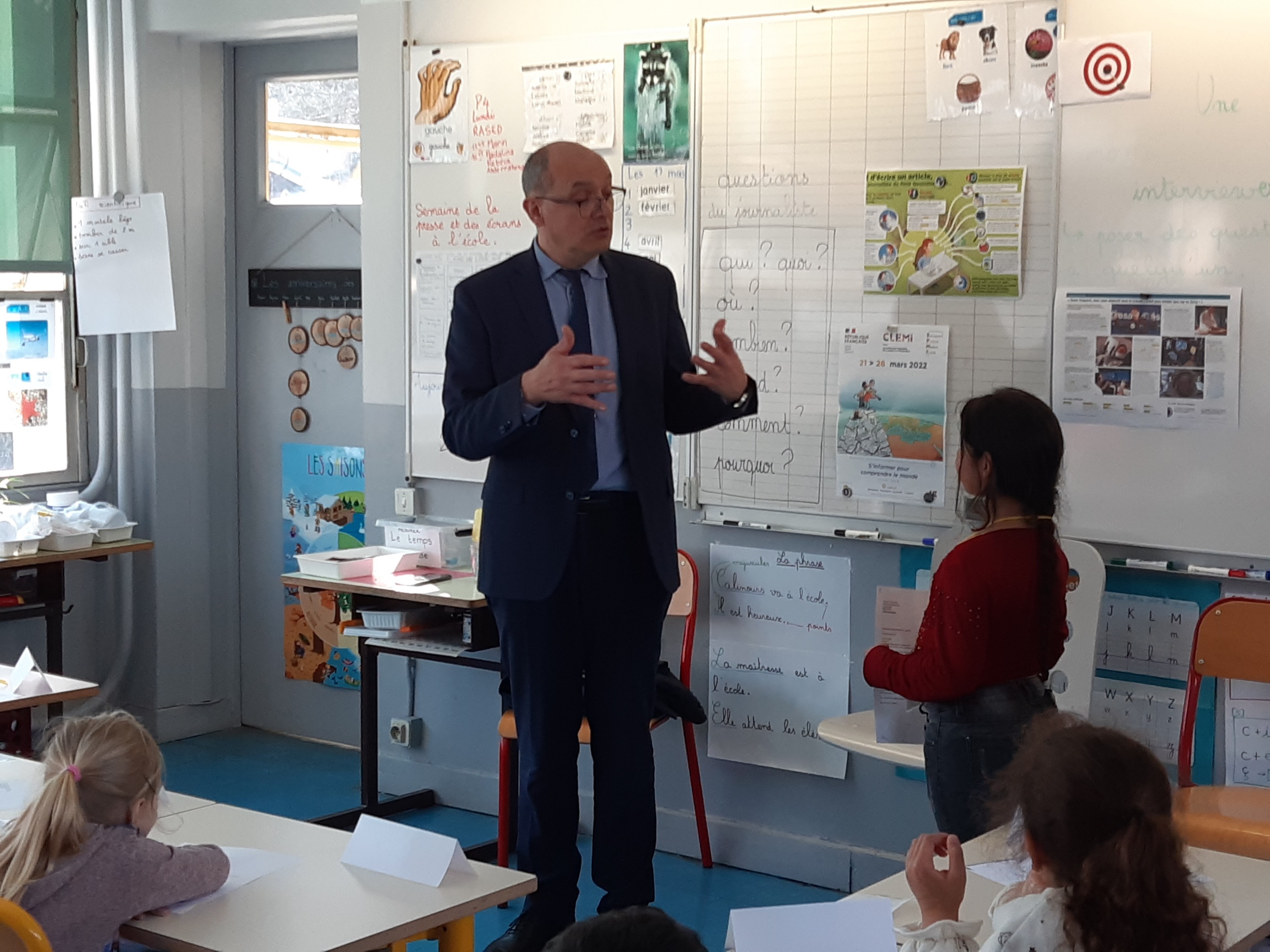 Le jour J, les enfants munis leur carte de presse ont posé leurs questions à Monsieur Bariller, Inspecteur d'Académie.